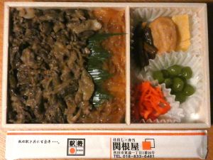 白いご飯の上を、すき焼き風の牛肉煮とこんにゃく(しらたき)煮が覆いつくした、 牛めし駅弁です。 牛肉煮とこんにゃく煮を別々に盛り付けているのが珍しく、食べる時に肉とこんにゃくをチョイスしてご飯にのせて食べるようになっています。どちらもすき焼き風の味付になっているので、自ずとご飯が進む設計になっています。しかも牛肉はやわらかく、こんにゃくともども味付がちょうどよい感じで、バランスよく作られていることがわかります。 付け合わせは、ぜんまい煮やがんも煮といった濃い味のおかずのほか、紅生姜とうぐいす豆が並んでいますが、後者は量が意外に多く感じられます。 製造元の創業当初から販売されている駅弁で、販売量一位の人気駅弁です。 |