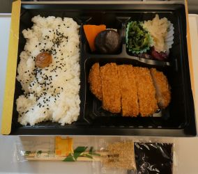 原 材 料 =ご飯/トンカツ/キャベツ酢漬/ 人参煮/高野豆腐煮/椎茸煮/梅干 ほか 容 器 = プラ製折箱 |