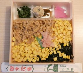 | 鳥栖駅名物の「かしわめし」の、錦糸卵の部分をコーンに変更したというレアなかしわめし駅弁です。 錦糸卵もコーンも黄色ですので、見た目の大きな違いは感じませんが、食べてみると大違いで、あっさり味の錦糸卵と異なり、コーンのしっかりした食感と甘い味がなかなか強烈で、これはこれでアリだと思わせてくれる「珍かしわめし」に仕上がっています。もちろんご飯は一般品と同じかしわご飯で、こちらのおいしさはあらためて言うまでもありません。 付合せはシュウマイ(鳥栖名物焼売)や菜の花漬、大根漬などで、レギュラー品として並ぶ予感がする逸品です。 |